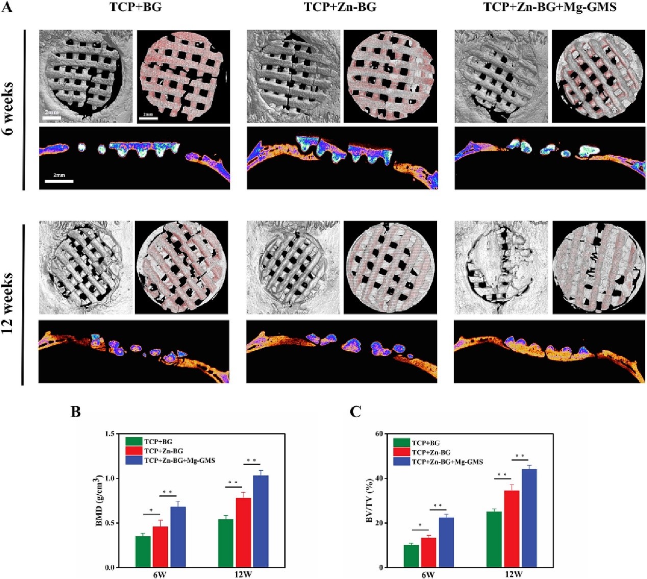 在骨修復過程中,神經-血管化網絡的重建在成骨過程中起著關鍵作用。因此,研究設計了一個3D打印的雙離子時序釋放功能平臺,以重建神經-血管化網絡,用于修復大段骨缺損。摻鋅生物玻璃(Zn-BG)中Zn2+的長期釋放能夠有效上調Runx-2和OCN的表達,從而促進BMSCs的成骨分化。Mg-GMS可以調節Mg2+的釋放時間和速度,有效激活VEGF和NGF的表達,以促進神經-血管化網絡的重建。研究還使用該功能平臺修復了大鼠的大段骨缺損。根據放射學和組織學檢查,3D打印的雙離子時序控釋支架顯著促進了早期血管化和神經發生,從而促進最終的骨再生和重塑。因此,上述支架有望用作修復大段骨缺損的骨移植物,并為修復材料的設計提供指導。