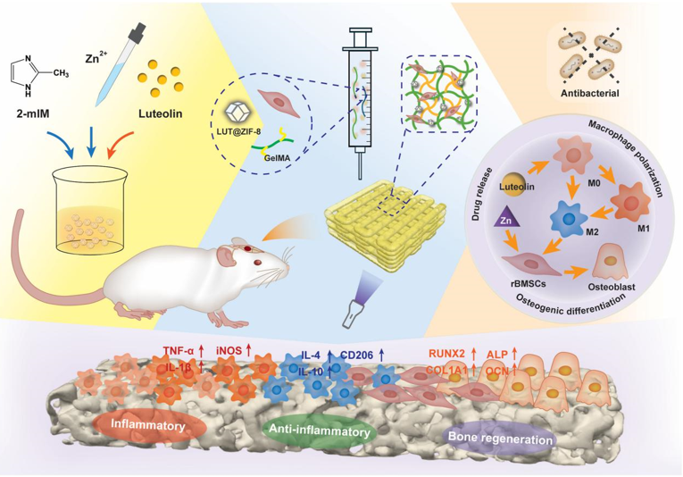 圖1. 用于骨再生的LUT@ZIF-8/GelMA生物打印支架的示意圖。