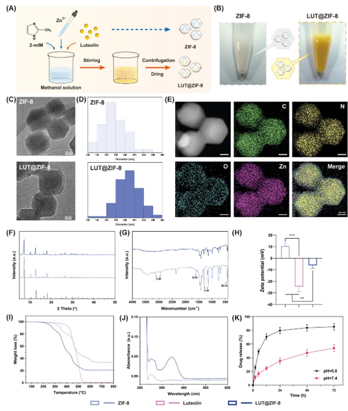 圖2. ZIF-8和LUT@ZIF-8納米顆粒的表征。