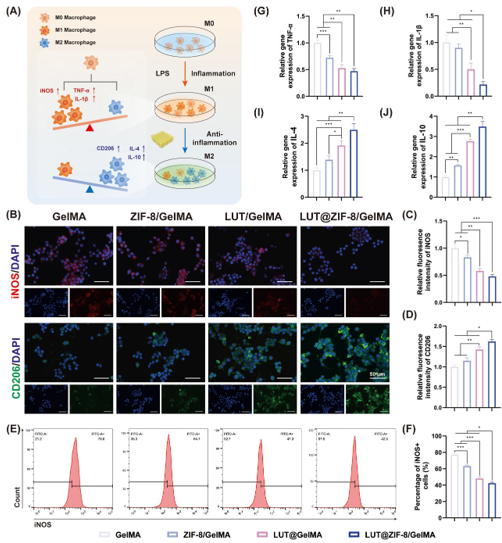 圖7. 水凝膠支架對巨噬細(xì)胞極化的調(diào)節(jié)。