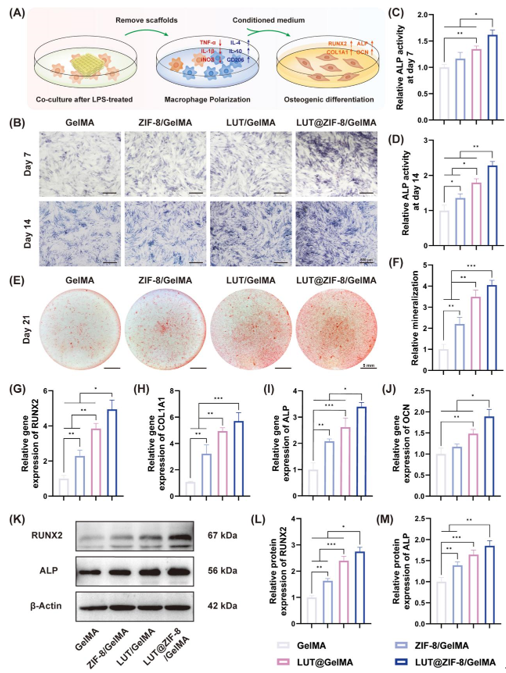 骨免疫學(xué)揭示了巨噬細(xì)胞在骨修復(fù)中的核心作用:通過直接接觸或分泌外泌體調(diào)控間充質(zhì)干細(xì)胞成骨分化。本研究通過構(gòu)建LPS誘導(dǎo)的炎癥微環(huán)境模型,評估LUT@ZIF-8/GelMA支架調(diào)控巨噬細(xì)胞極化對rBMSCs成骨分化的影響(圖8A)。結(jié)果顯示,經(jīng)該支架處理的巨噬細(xì)胞條件培養(yǎng)基顯著提升rBMSCs的ALP活性(圖8B-D)及礦化結(jié)節(jié)密度(圖8E-F)。RT-qPCR與Western blot證實其成骨基因(RUNX2/COL1A1/ALP/OCN)及蛋白表達(dá)均最優(yōu)(圖8G-M)。機(jī)制上,支架釋放的木犀草素與Zn2?協(xié)同誘導(dǎo)M2型巨噬細(xì)胞極化,分泌促修復(fù)細(xì)胞因子,有效逆轉(zhuǎn)炎癥微環(huán)境對成骨分化的抑制作用。該研究闡明免疫調(diào)控-成骨分化級聯(lián)機(jī)制,為構(gòu)建免疫微環(huán)境響應(yīng)型骨修復(fù)材料提供新思路。