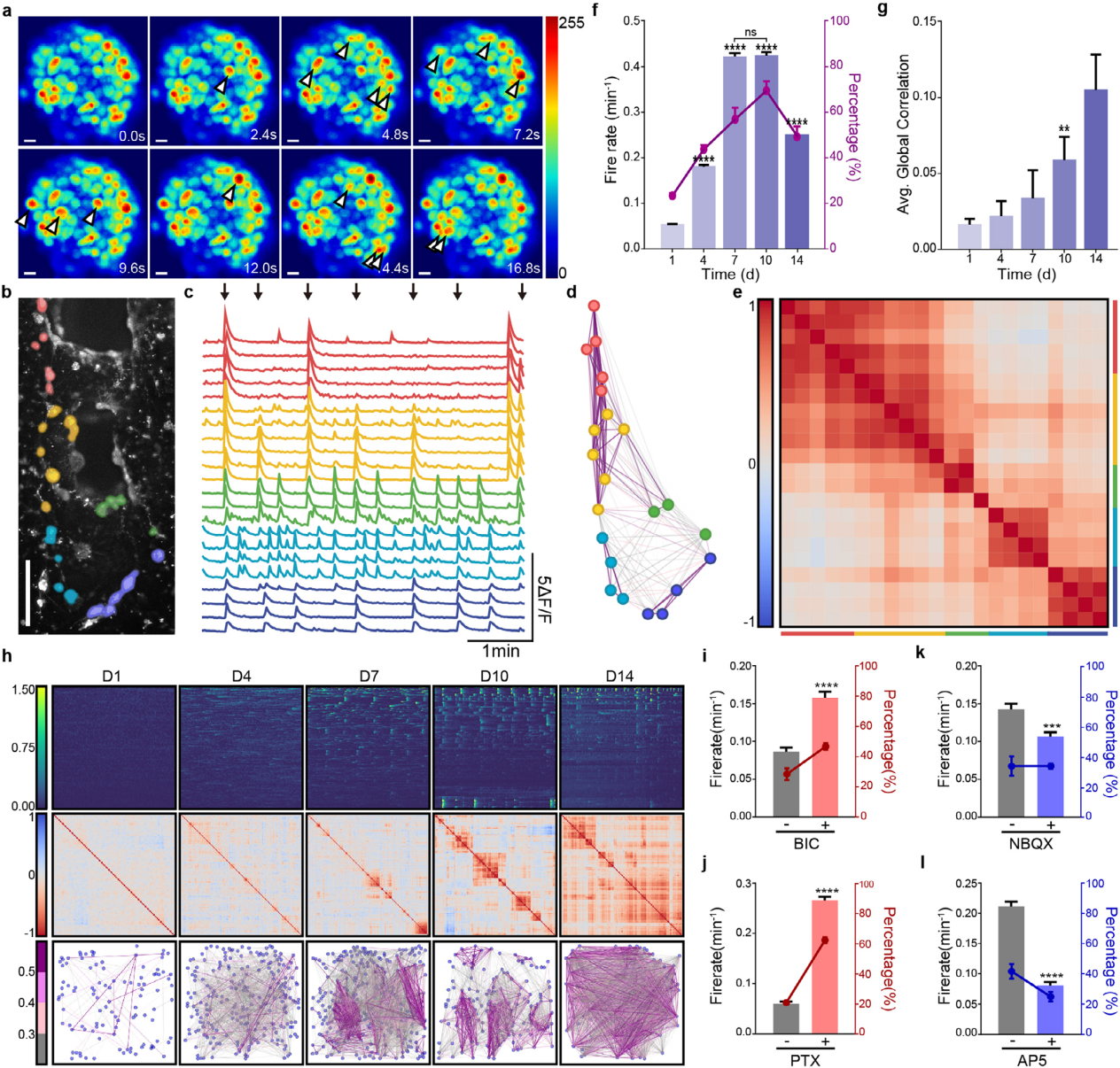 利用Fluo-4 AM可視化鈣振蕩,評(píng)估3D neuMatrix的神經(jīng)功能。微觀層面,簇內(nèi)神經(jīng)元獨(dú)立振蕩并間歇性協(xié)調(diào)放電。介觀尺度下,神經(jīng)簇可分為5組,組內(nèi)鈣放電高度同步,相距2 mm的簇組間也存在同步放電,證實(shí)其形成大規(guī)模功能性神經(jīng)網(wǎng)絡(luò)(圖3a-e)。分析 DIV1-14的鈣信號(hào)發(fā)現(xiàn),平均放電率、檢測(cè)到鈣放電的簇百分比隨培養(yǎng)時(shí)間上升,DIV 14略有下降,與細(xì)胞活力趨勢(shì)一致。全局平均相關(guān)性持續(xù)增加。綜合考慮,選擇DIV 7為后續(xù)研究時(shí)間點(diǎn)(圖3f - h)。通過(guò)神經(jīng)遞質(zhì)受體拮抗劑處理探究小分子影響,抑制GABA受體(BIC、PTX)顯著提升放電率,抑制谷氨酸受體(NBQX、AP5)則降低放電率;除AP5外,其余處理后全局平均相關(guān)性下降。該結(jié)果表明,興奮性與抑制性神經(jīng)元共同參與網(wǎng)絡(luò)形成,二者平衡維持同步性,且3D neuMatrix對(duì)小分子的功能響應(yīng)特性,使其適用于CNS疾病建模與藥物篩選(圖3i - l)。