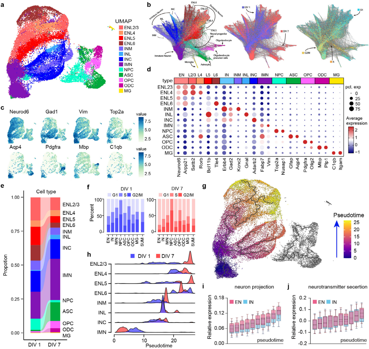 偽時(shí)間分析顯示,神經(jīng)元呈現(xiàn)從未成熟神經(jīng)元(IMN)到分化神經(jīng)元的發(fā)育軌跡。IMN高表達(dá)放射狀膠質(zhì)細(xì)胞標(biāo)志物(Fabp7、Vim),兼具泛神經(jīng)元特征但缺乏成熟標(biāo)志物,可能從分裂狀態(tài)轉(zhuǎn)變?yōu)樾菝郀顟B(tài);成熟神經(jīng)元的神經(jīng)投射和遞質(zhì)分泌功能隨時(shí)間顯著增強(qiáng),突觸組裝富集度維持較高水平(圖5g-j)。